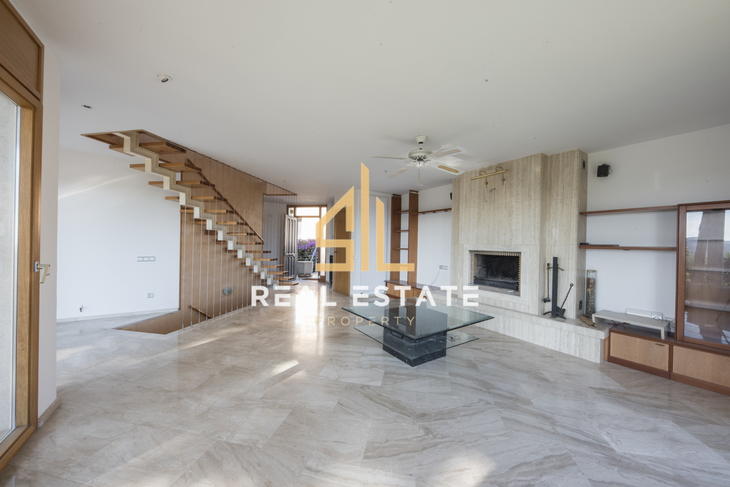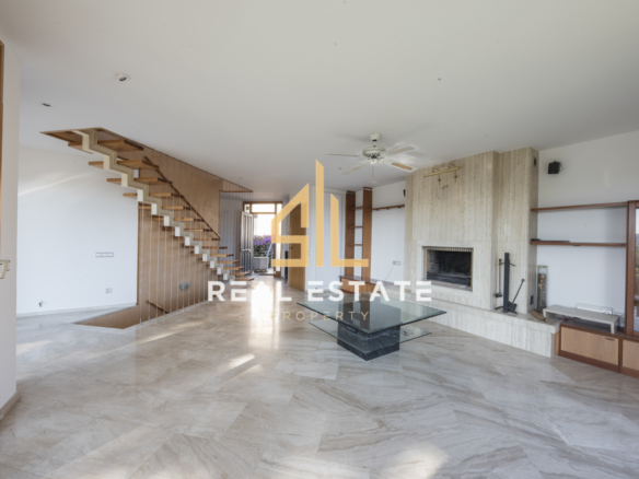 Amplio salón y comedor independientes, con suelos de mármol pulido, chimenea revestida en mármol y grandes ventanales que llenan el espacio de luz natural.