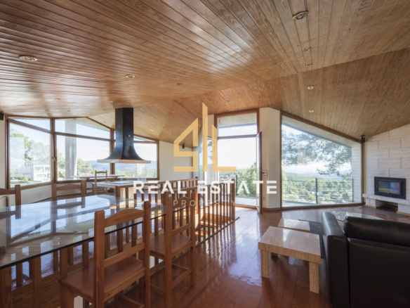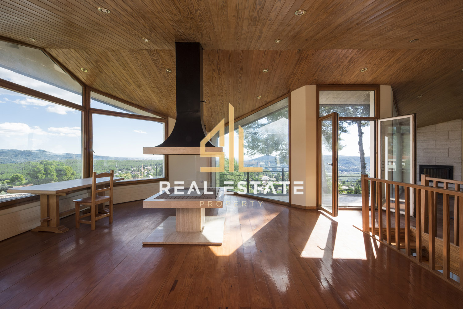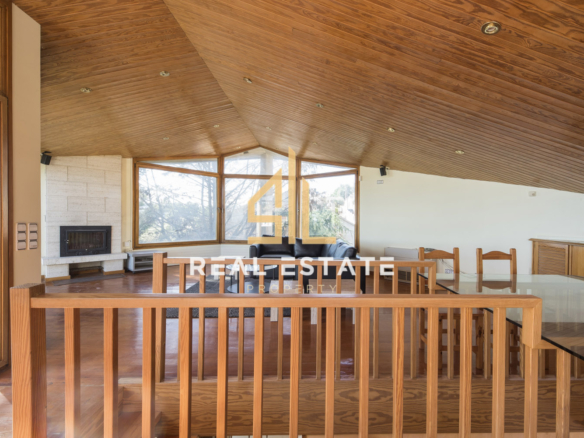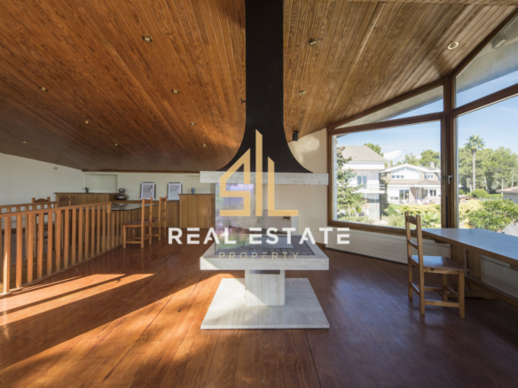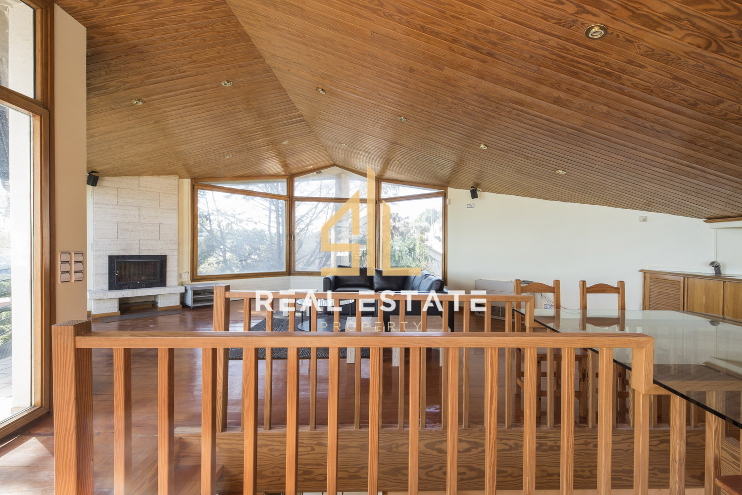 Espacio diáfano con techos altos de madera, dos chimeneas funcionales y salida a una terraza solárium con vistas despejadas al entorno natural.