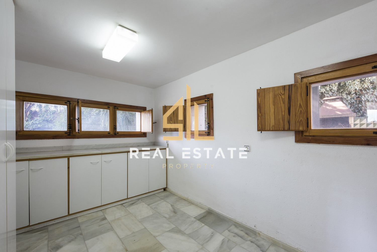La cocina independiente, equipada con placa de inducción, encimeras de granito, muebles blancos y amplios ventanales, dispone de salida directa al exterior mediante una terraza con escaleras que bajan al jardín posterior.